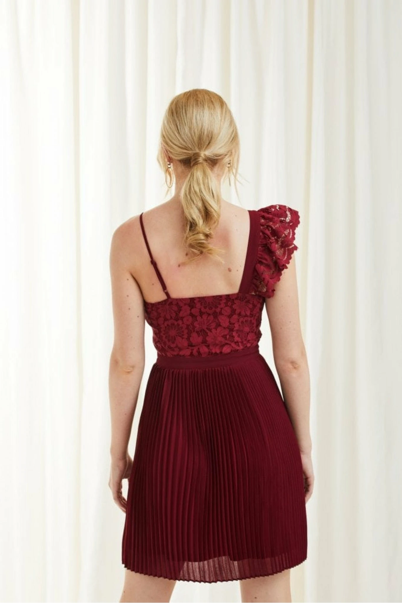 This asymmetric lace dress is perfect for fancy occasions such as weddings or a cute date night out. It features an asymmetric design with a thin strap on one side and shoulder frill detail on the other. It boasts a lace body with a wrap front design and a delicate pleated skirt. Finished with an invisible zip fastening.
