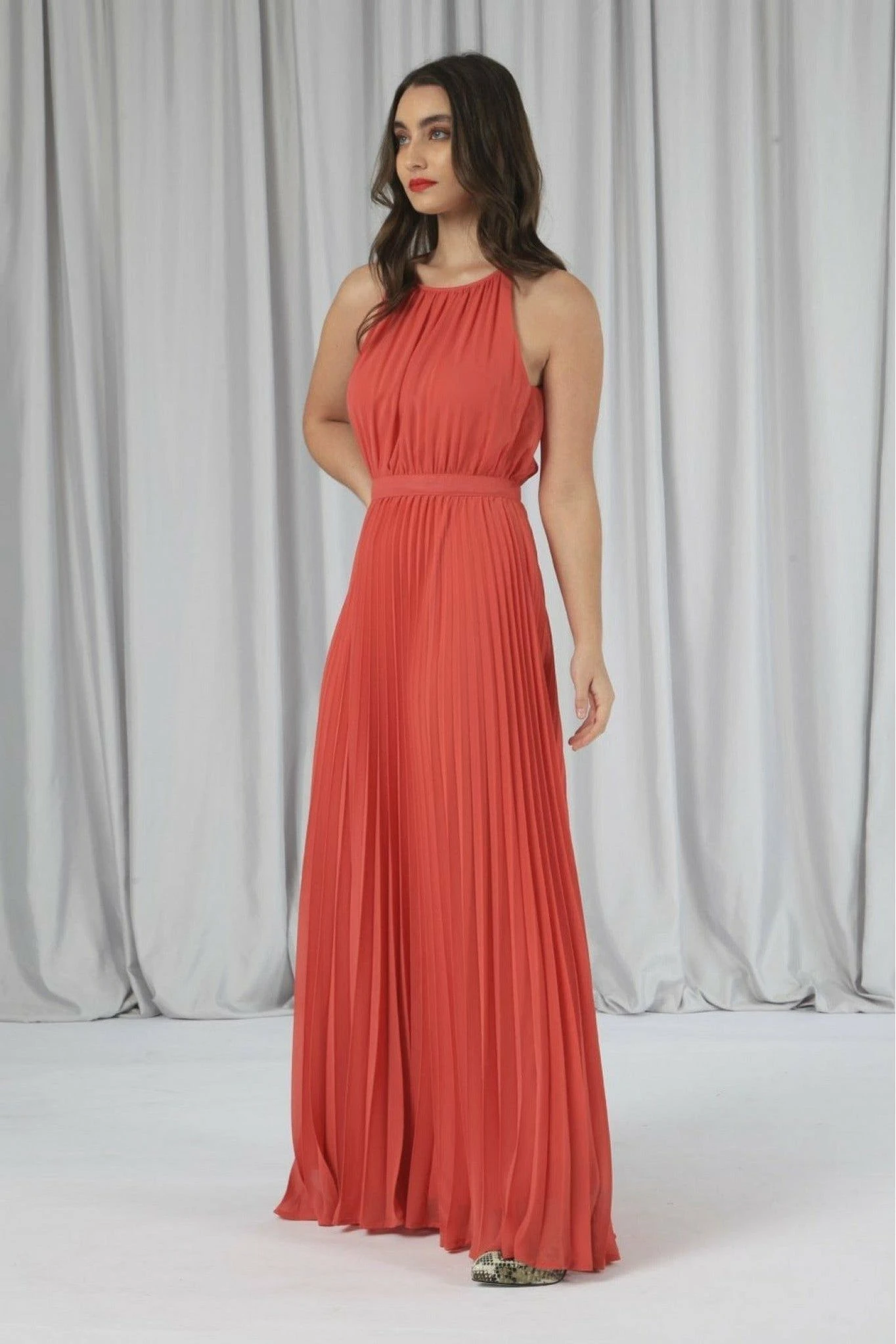 This beautiful coral red maxi dress is bridesmaid approved and fit for fancy occasions. It features a flowy floor length design, tie neck detail and a pleated skirt. Also featuring waistband detail and an invisible zip fastening.