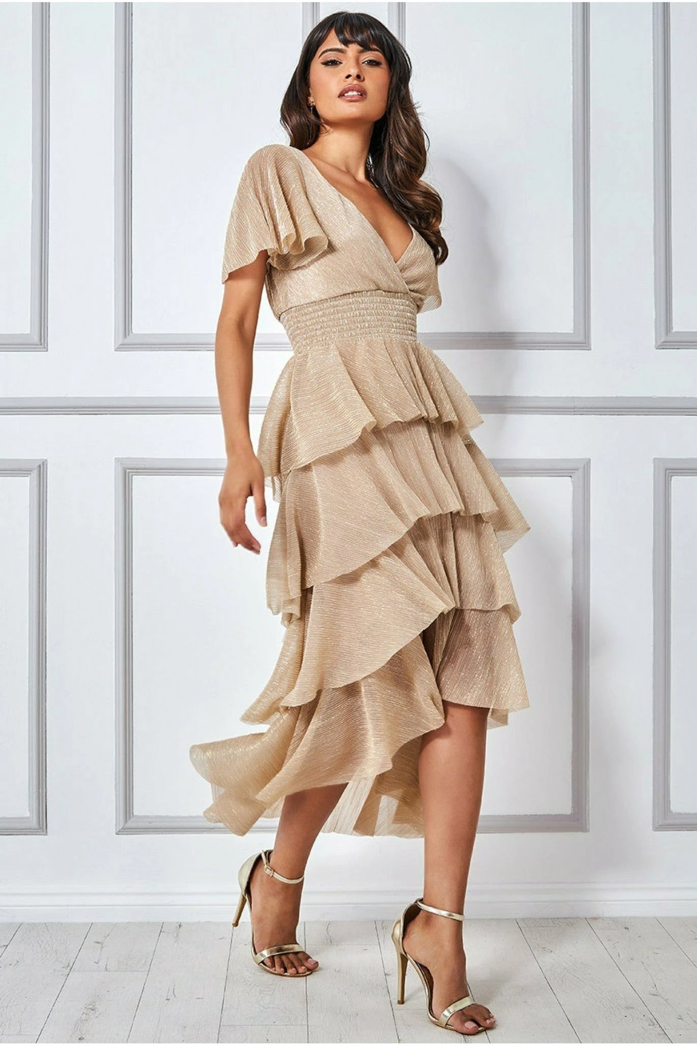 Goddiva Crinkle Lurex High Low Layered Midi Dress – Gold