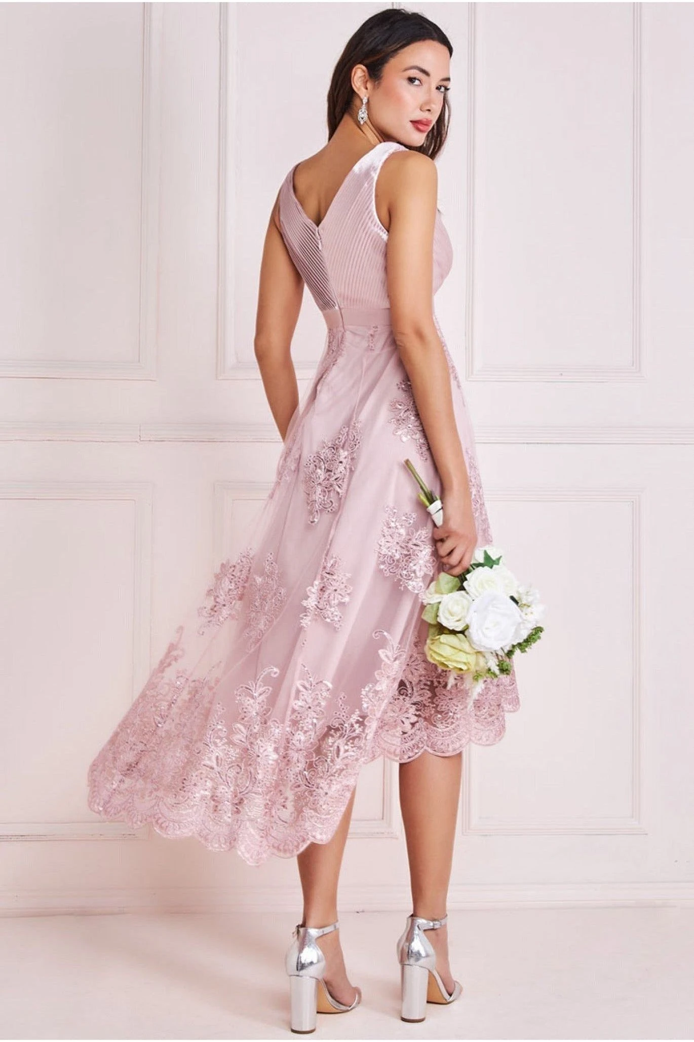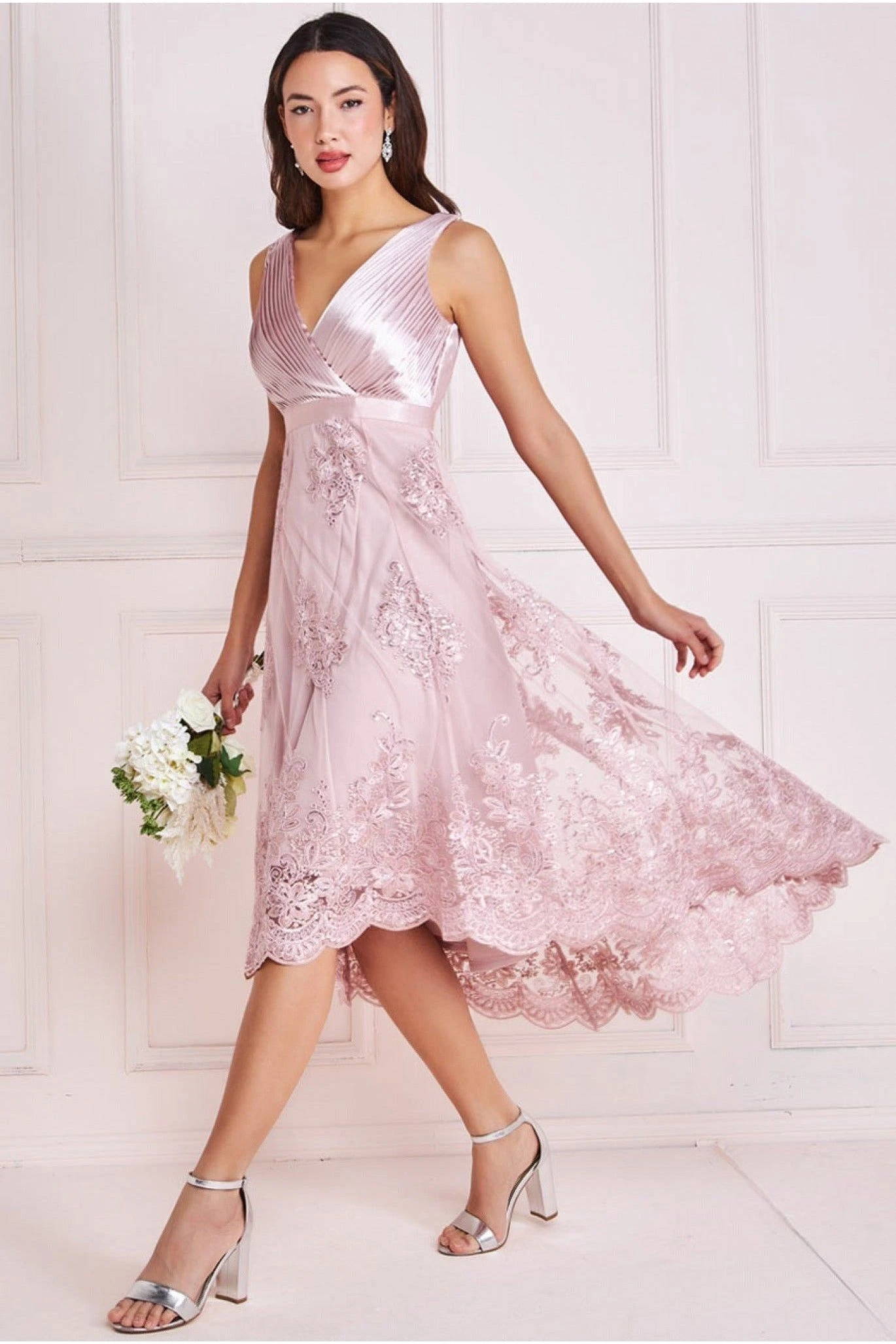 Goddiva Pleated Satin V Neck High And Low Midi – Pink