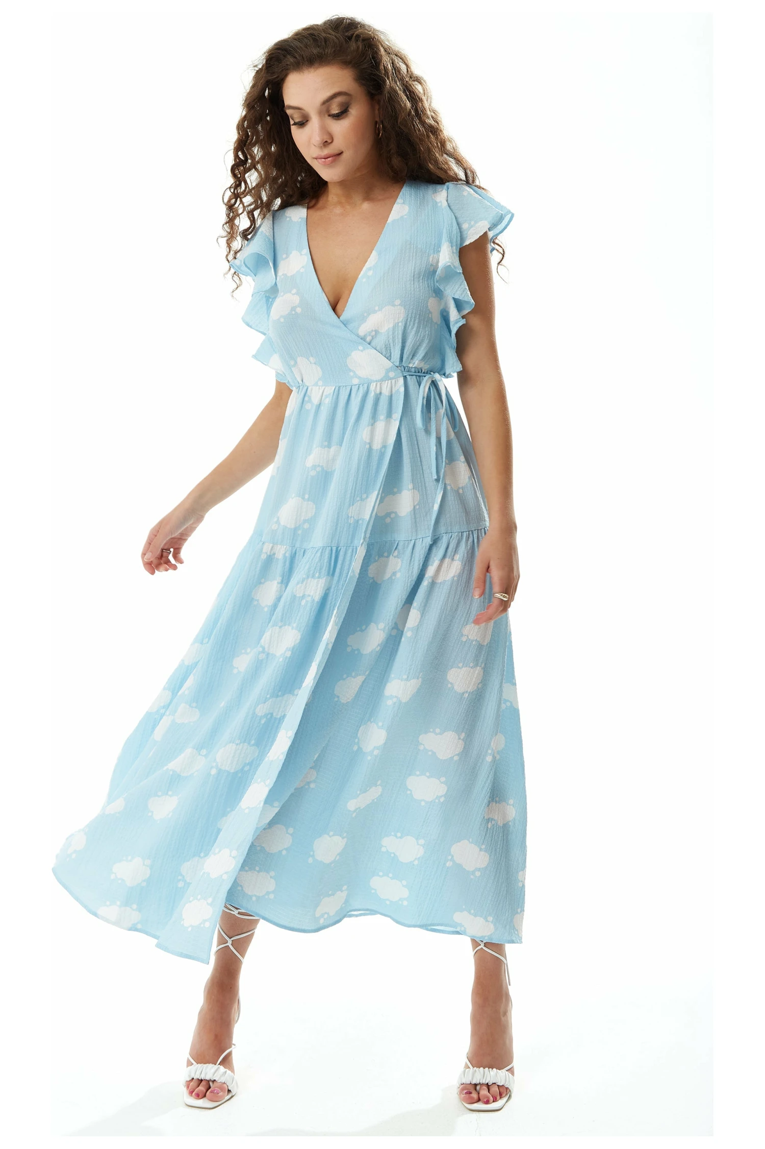 Liquorish Cloud Print Midi Wrap Dress With Frill Sleeve Blue