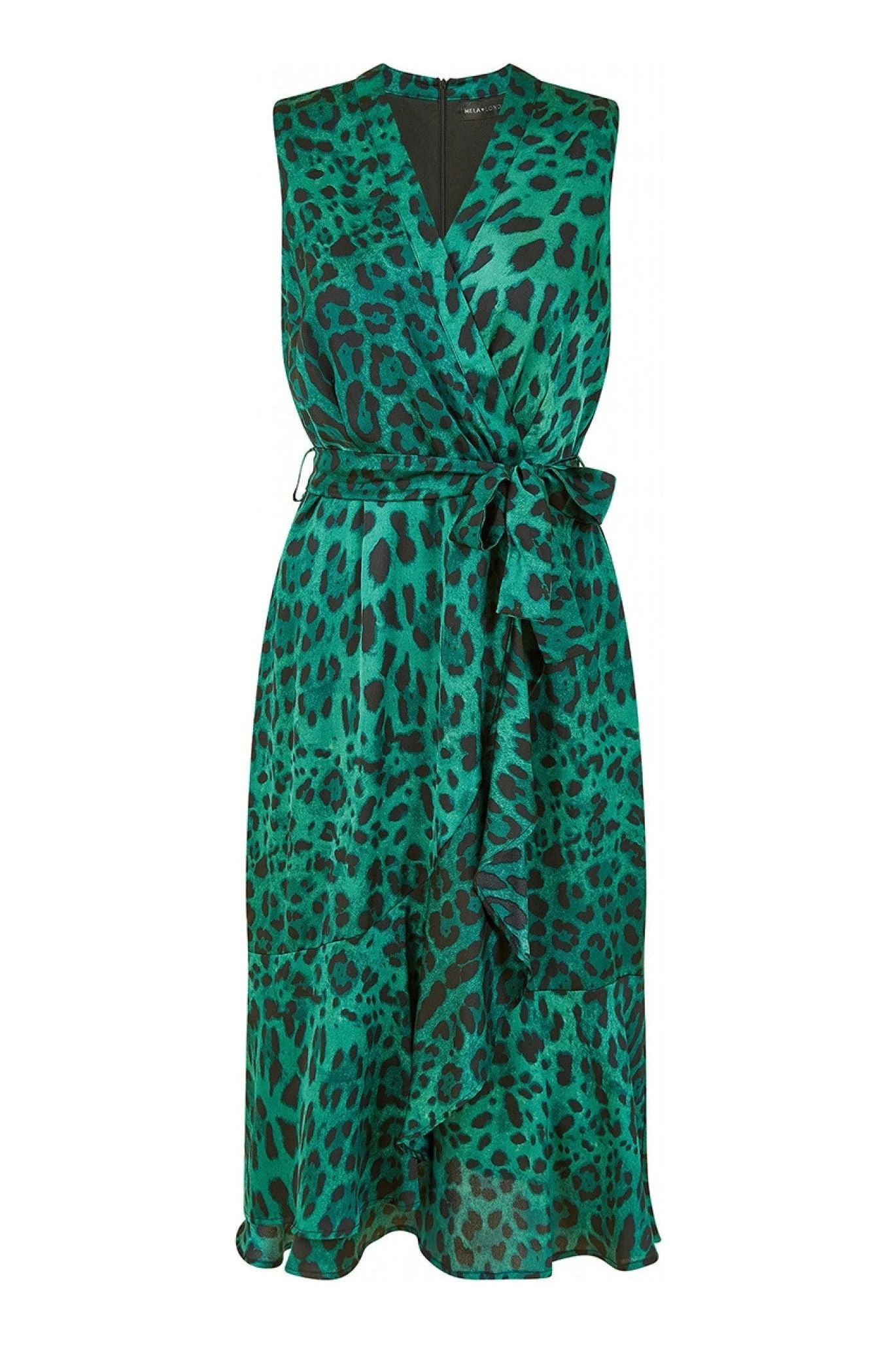 Mela London Green Animal Print Satin Wrap Midi Dress