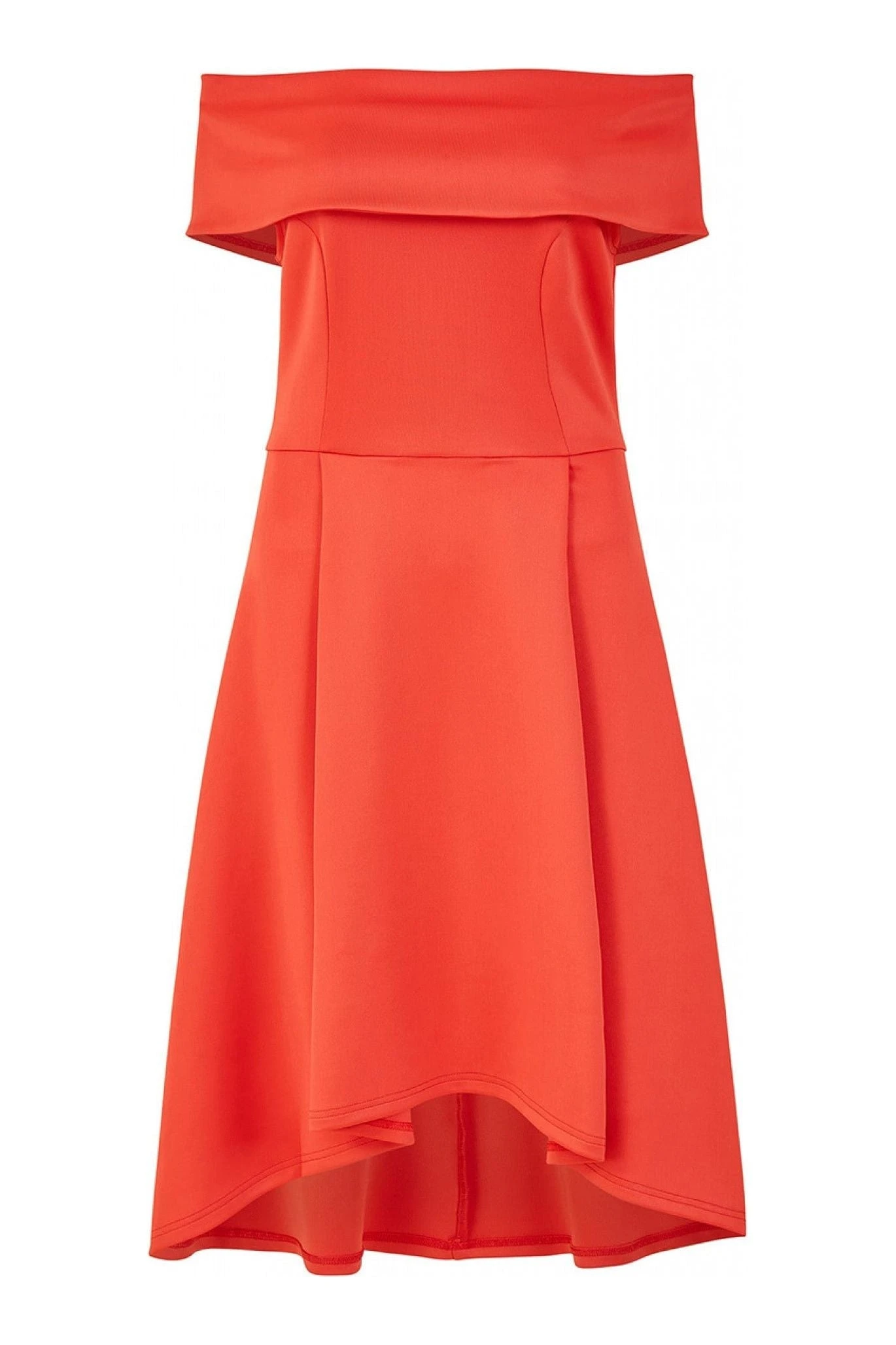 The Mela Red Bardot Dipped Hem Dress is calling to be worn for all the special occasions this season. The fold over Bardot neckline is flattering and the shape overall is enhanced by the cinched in bodice and skater style skirt that has a dipped back.