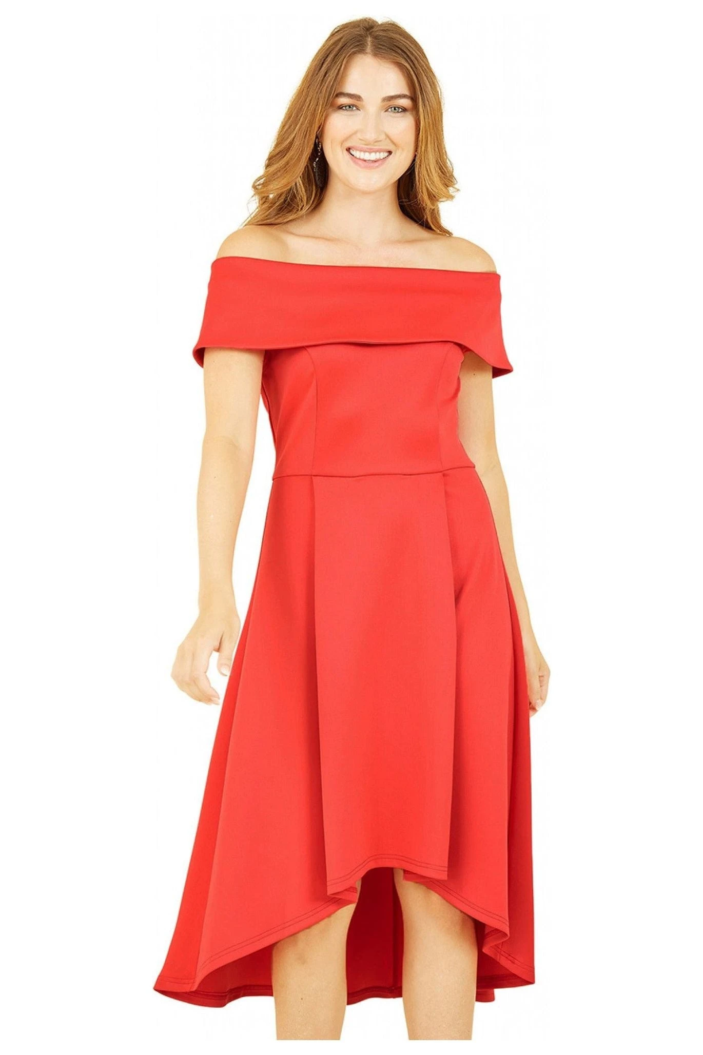 Mela London Red Bardot Dipped Hem Dress
