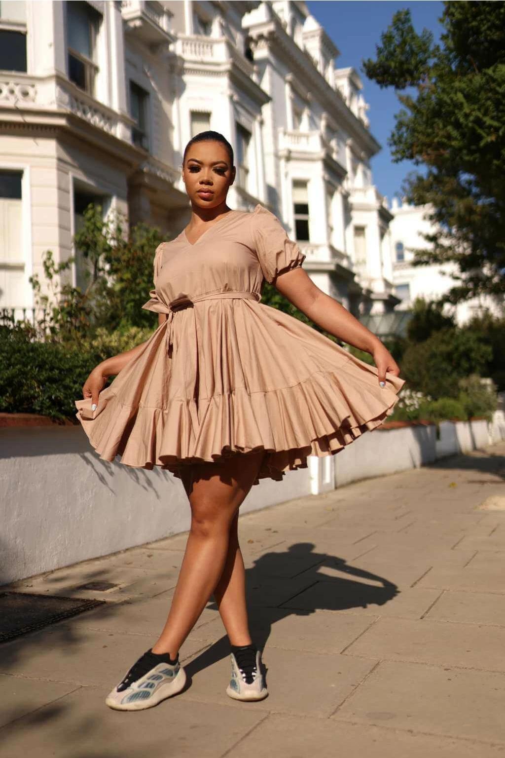 Nude Poplin Dress Gathered Hem- Class on another level. Our latest beige poplin dress screams luxury on the level of its own. This dress will instantly make you look boujee, classy and significant. Sis, they will literally roll the carpet for you. Its gathered details give you the volume and that flattering expensive finish, while the two side pockets complete the killer look. This beige cotton dress is readily hot and stylish, comes with a poplin belt but it also goes well with a black or brown belt. Can be paired with nude, brown, black or clear heels for a more dressed up look. Let me warn you, this dress is all classy but if you are trying to dress down, pair it with sandals, boots or trainers. Either way, you will be the star of the show and sure you will seize the moment.