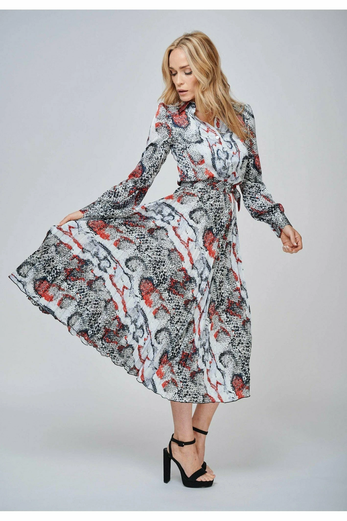 The IRIS dress is the perfect feminine dress. Multicoloured print in abstract snake print with hues of grey, white and red. Collared and button shirt on the top half with flowing sun-ray pleating for the bottom half. It has an elasticated waist making it extremely comfortable. Volume sleeves with three buttoned cuff detailing. The dress comes with a matching belt, lined with block red colour. This brings out the red elements in the print.